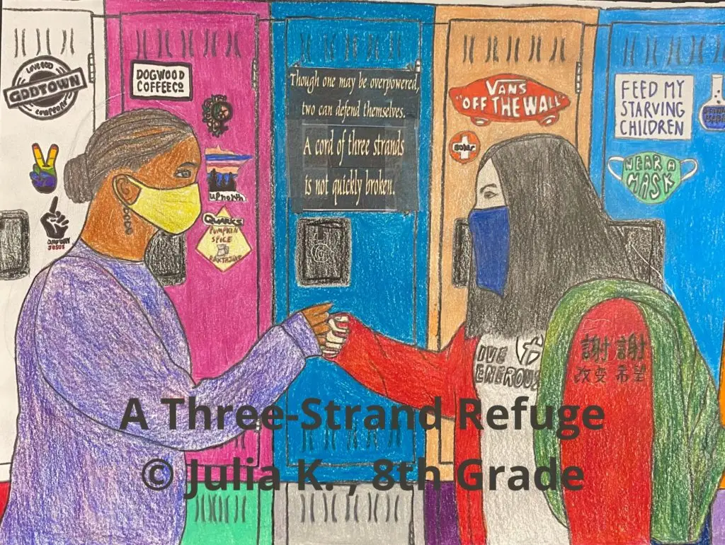 I wanted the fist bump in my art to reflect a “we did it” feeling. It is a more fun handshake to say, “we made it through and are still together.” I put extra small written words in my drawing to share things that have happened. The verse in the background reflects how God has helped us. The scripture was placed there to speak to fellow classmates of how “a cord of three strands is not easily broken.”
