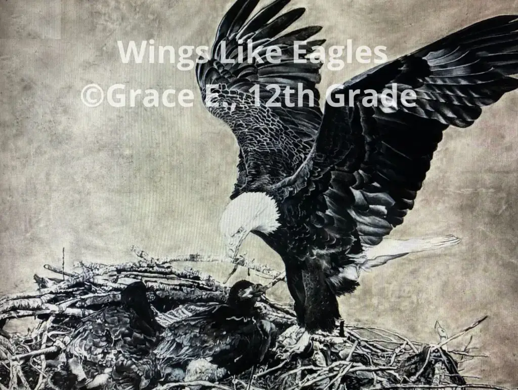 I decided to draw a bald eagle, because eagles are large, strong and powerful creatures, similar to God’s might and power. They also have an enormous wingspan of up to more than seven feet. Bald eagles have incredible vision and are extremely attentive, just like how God sees us and meets our needs, no matter how big or small. They defend their young, like how God defends his children and stands up for us, and bald eagles are very nurturing animals, like how God is compassionate to his children and values intimate relationships with his children. Overall, the bald eagle exemplifies many of God’s character traits. In my artwork, I wanted to share the message that God is over us no matter what happens in our lives.