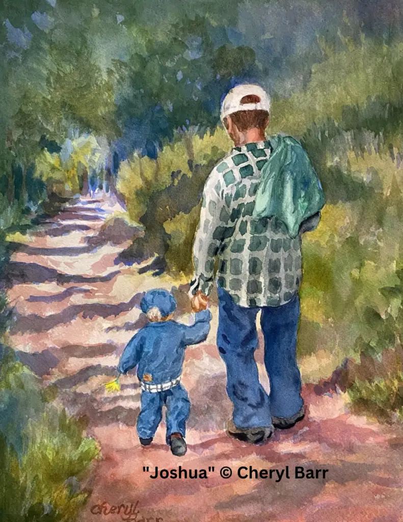 Bible Story Focus – Joshua: The story of Joshua in Scripture reveals how God cares about each one of us and sovereignly leads us into a future He has lovingly planned. As I painted our son Joshua leading his small son on a mountain path, I found comfort in those promises and took courage for the unknown terrain ahead of me in my own life.