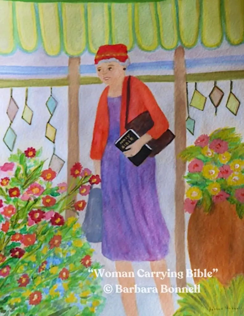 This painting, showing a woman carrying a Bible, represents a person following the Lord Jesus Christ—her love of Him and the Word of God.  She walks with assurance and peace because she has “hidden” His Word in her heart, and that Word protects her from sin and shines light on her every path. Through Scripture, God reveals truths about Himself, the sinful nature of the human heart, and His power to change our hearts through the Lord Jesus.