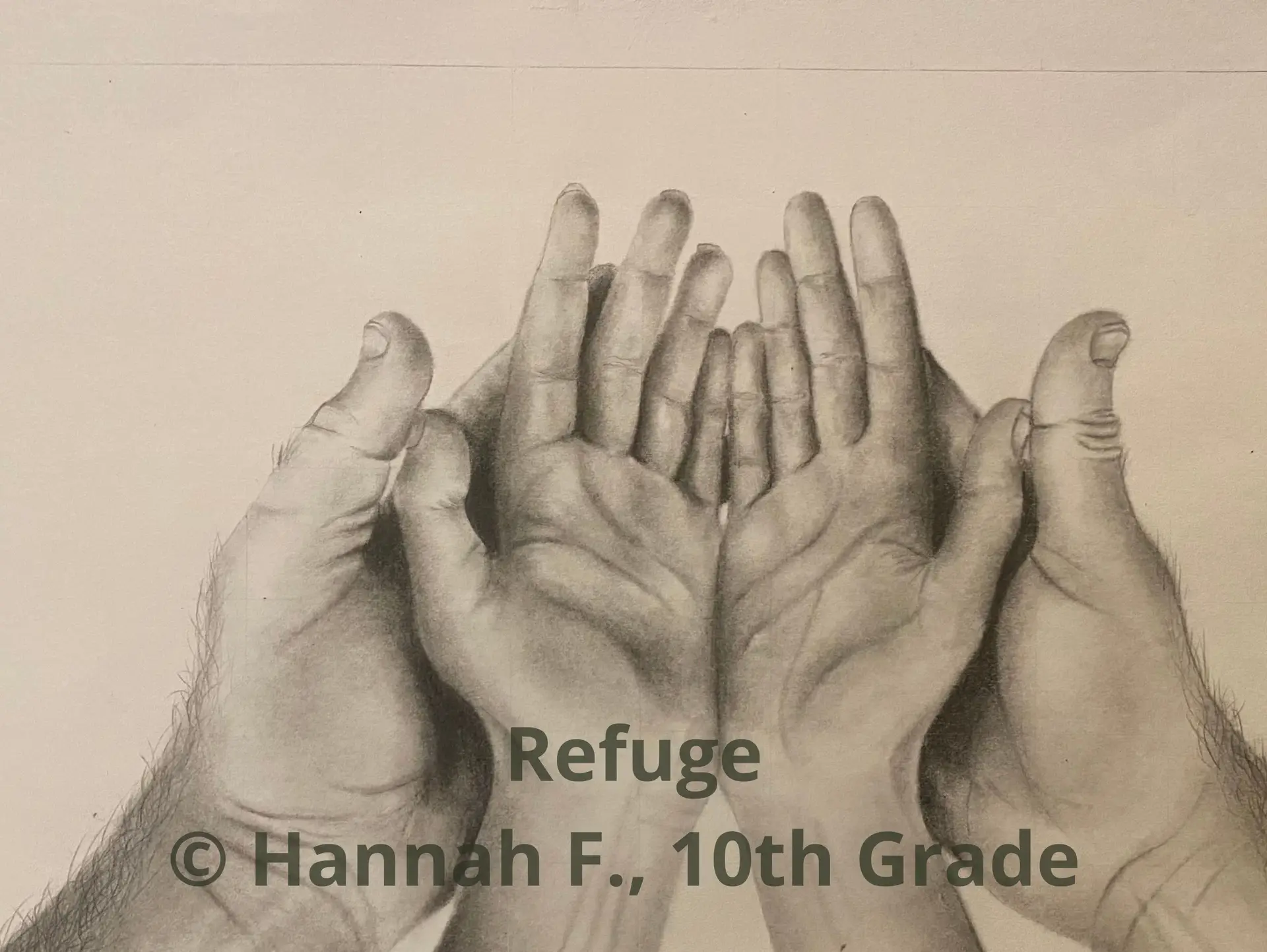 Artist: Hannah, 10th Grade, Southwest Christian High School, Chaska, MN. Medium: Graphite Pencil Scripture: God is our refuge and strength, an ever-present help in trouble.