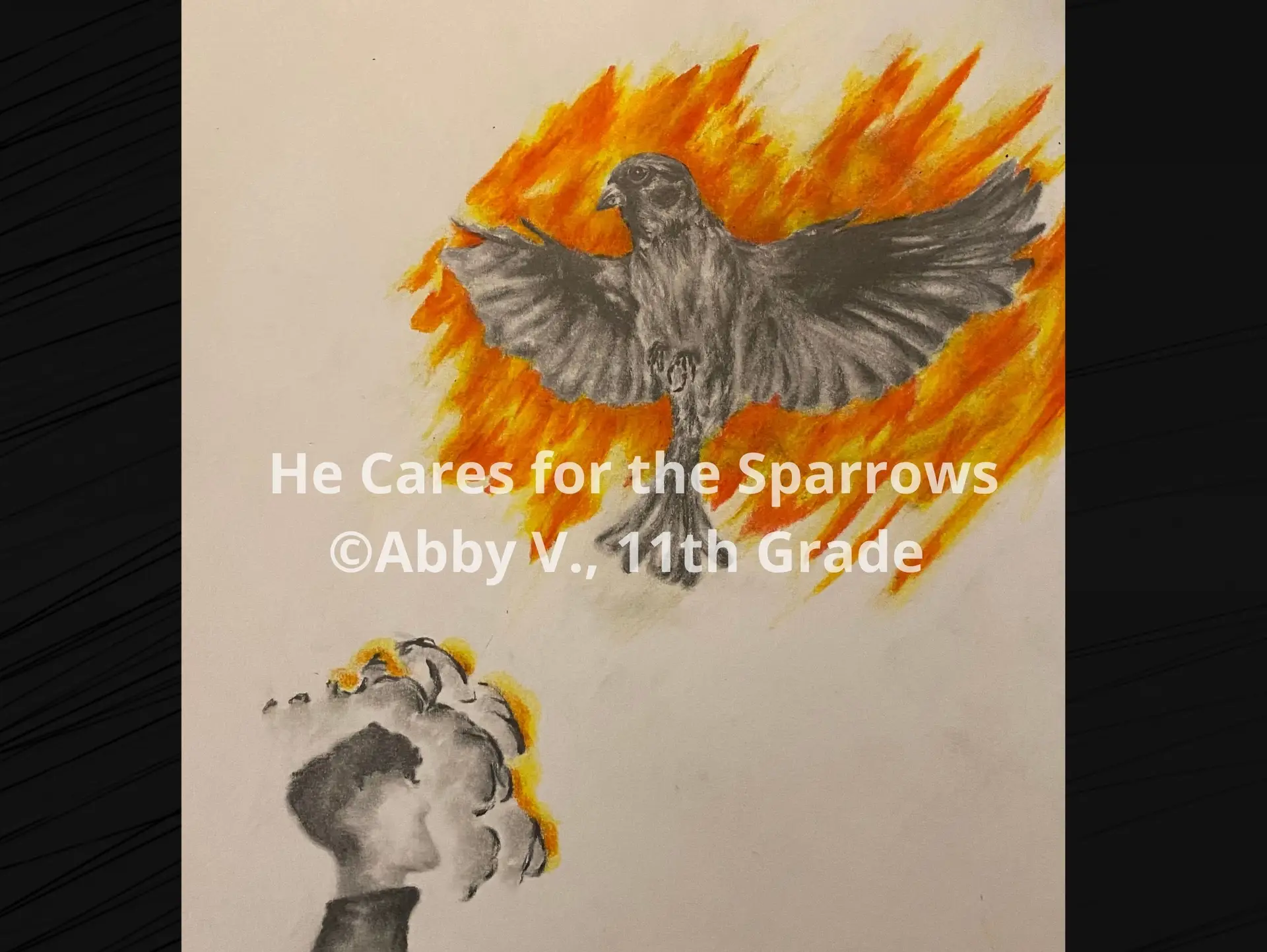 Artist: Abby, 11th Grade, Southwest Christian High School. Medium: Pencil and Colored Pencil. Scripture: Are not two sparrows sold for a penny? Yet not one