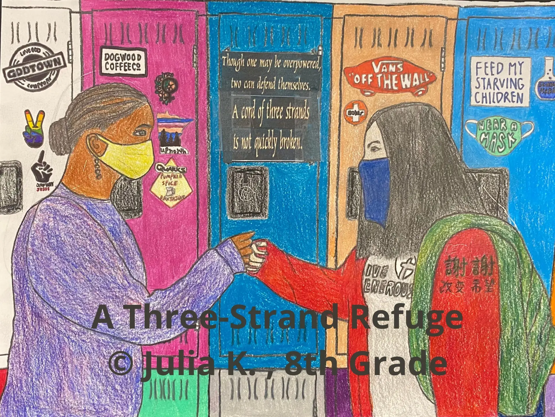 Artist: Julia, 8th Grade, Hand in Hand Christian Montessori, Roseville, MN. Medium: Graphite and Colored Pencils. Scripture: Two are better than one, because they have