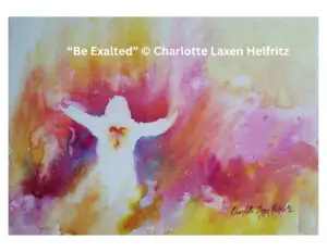 God’s glory comforts us and wraps us in His love. By Charlotte Laxen Helfritz, Fresh Oil Artist. Scripture: Based on Psalm 108:5 (NLT) “Be exalted, O God, above the highest heavens. May your glory shine over all the earth.” Medium: Watercolor on Canvas Panel. Reflection: God’s glory is beyond imagining. When I see moments of