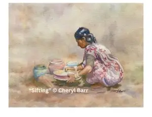 A woman in India sifted rice. For her it was an ordinary day, but for me, it was a lesson about glorifying God. By Cheryl Barr, Fresh Oil Artist. Media: Watercolor on Arches paper. Scripture: Based on 1 Corinthians 10:31 (NIV) “So whether you eat or drink, or whatever you do, do it all for